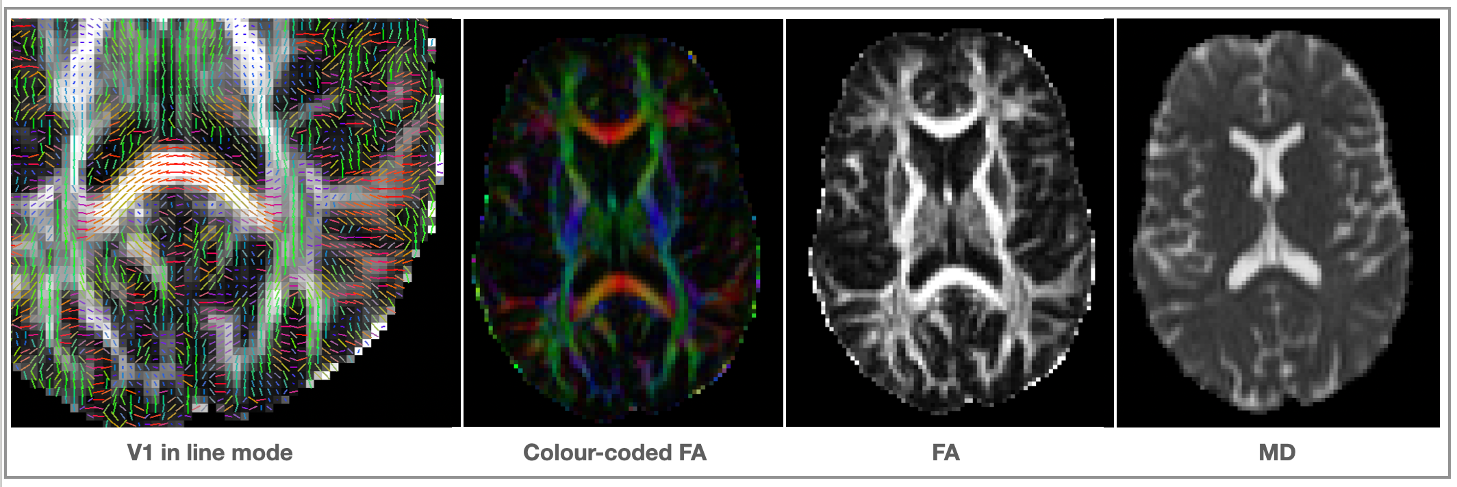 <basename>_V1- 1st eigenvector<basename>_V2- 2nd eigenvector<basename>_V3- 3rd eigenvector<basename>_L1- 1st eigenvalue<basename>_L2- 2nd eigenvalue<basename>_L3- 3rd eigenvalue<basename>_MD- mean diffusivity<basename>_FA- fractional anisotropy (isotropic ~ 0; stick-like ~1)<basename>_MO- mode of the anisotropy (oblate ~ -1; isotropic ~ 0; prolate ~ 1)<basename>_S0- raw T2 signal with no diffusion weighting
