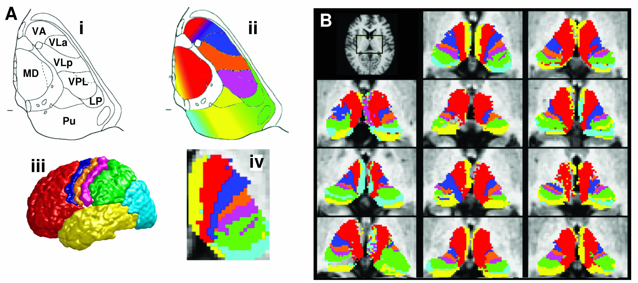 To estimate the voxelxROI connectivity probtrackx quantifies connectivity values between each voxel in a seed mask and any number of user-specified target masks. In the example above, seed voxels in the thalamus are classified according to the probability of connection to different cortical target masks.