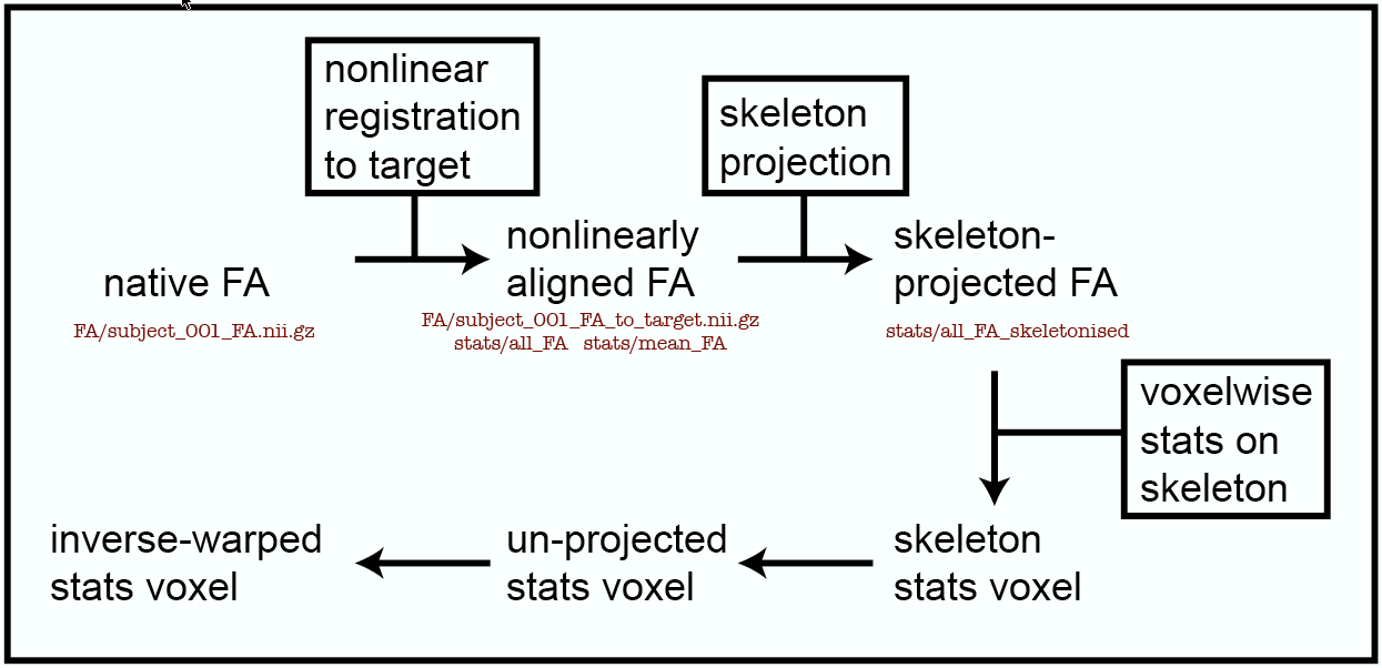 tbss_1_preproc- prepare your FA data in your TBSS working directory in the right formattbss_2_reg- apply nonlinear registration of all FA images into standard spacetbss_3_postreg- create the mean FA image and skeletonise ittbss_4_prestats- project all subjects' FA data onto the mean FA skeleton- stats (e.g.,
