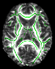 The above results in a standard-space version of each subject's FA image; next these are all merged into a single 4D image file called all_FA, created in a new subdirectory called stats. Next, the mean of all FA images is created, called mean_FA, and this is then fed into the FA skeletonisation program to create mean_FA_skeleton.