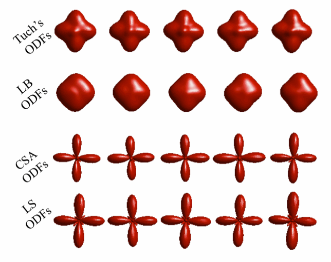 qboot allows reconstruction of q-ball ODFs (Tuch DS, MRM 2004), CSA ODFs (Aganj I et al, MRM, 2010) and variants of them, obtained via Laplacian sharpening and Laplace-Beltrami regularization (Descoteaux et al, MRM, 2007). Both spherical harmonic coefficients of the reconstructed ODFs and fibre orientation estimates may be returned as output. A real spherical harmonic basis is employed (Aganj I et al, MRM, 2010).