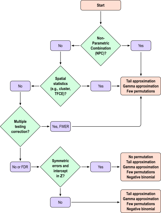 | Few permutations | Compute the p-values using just a few permutations, e.g., less than a thousand. | Univariate and multivariate tests (CMV and NPC), both uncorrected and corrected (FWER and FDR). Spatial statistics available (TFCE and cluster). | -n <nperms> |