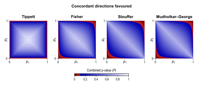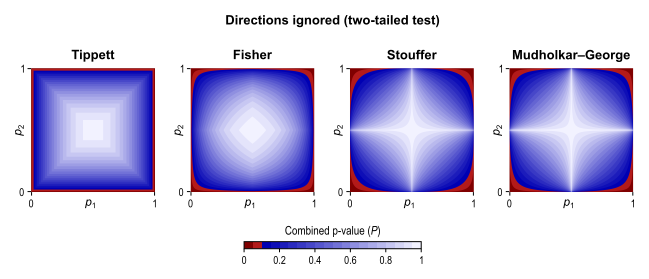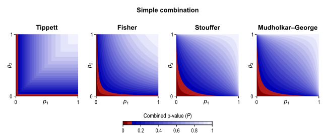 The rejection region for the joint null hypothesis depends on how the combined statistic is produced. Various combining functions can be considered. Some of these were developed for applications such as meta-analyses. The figure below shows the rejection regions for four different popular combining functions, i.e., the ones attributed to Tippett, Fisher, Stouffer, and Mudholkar-George, and considering two partial tests, for which p-values (p1 and p2) are available.