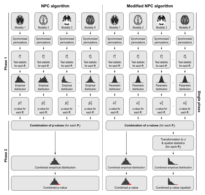 The solution is to use a modified version of the NPC, starting from the principles that underlie direct combination of statistics, by computing for each partial test quantities that behave similarly as p-values; we call these as "u-values", to emphasise that they are not meant to be read or interpreted as p-values, but rather as transitional values that allow combinations that otherwise would not be possible. The algorithm proceeds then in single phase, with permutations being performed on-the-fly, and with no need for storage of the complete permutation distribution at each voxel. Another modification needed for brain imaging refers to spatial statistics: the asymptotic distribution of the combined statistic is used, this time to produce a z-score, from which cluster extent, cluster mass, and TFCE can be computed. A flow chart showing both the original and the modified algorithm is shown below.